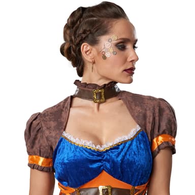 Damdräkten Kvinnlig Steampunk-äventyrare består av en färgglad klänning med kort ärm och kjol i tre delar. Underkjolen är av tyll, de båda övre lagren av mjuk sammet och fin satin. Dräkten har en läderliknande överdel. Framtill finns en korsett med antydd snörning och gyllene dekorationer. Dekolletaget har volanger och avgränsas upptill av en krage. I ryggen finns en dragkedja. Dessutom medföljer handledsvärmare av konstläder med rosetter och sammetsinsats, material: 100 % polyester.