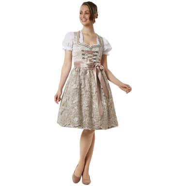Den mjuka färgkontrasten mellan rosa och beige framstår som elegant, kvinnlig och ändå modern – en kombination som nytolkar klassiska folkdräktselement. Dirndlen kan utmärkt kombineras med ljusa blusar, subtila smycken och pumps eller ballerinaskor i rosé eller kräm.