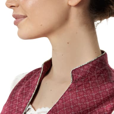 Livstycket i djup burgunderröd är försett med en diskret prickstruktur och smickrar varje figur med sin skräddarsydda passform. En elegant knappslå med antiksilverfärgade dekorationsknappar ger inte bara autentisk charm, utan också optimal hållbarhet och bekväm passform. Den högslutna kragen med ståkrage sätter dessutom en raffinerad accent och understryker dirndlens traditionella utseende.