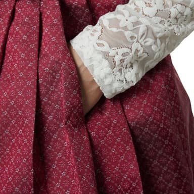 Livstycket i djup burgunderröd är försett med en diskret prickstruktur och smickrar varje figur med sin skräddarsydda passform. En elegant knappslå med antiksilverfärgade dekorationsknappar ger inte bara autentisk charm, utan också optimal hållbarhet och bekväm passform. Den högslutna kragen med ståkrage sätter dessutom en raffinerad accent och understryker dirndlens traditionella utseende.