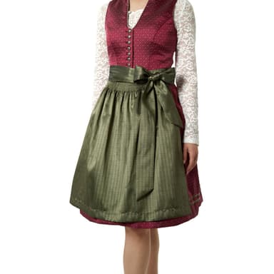 Livstycket i djup burgunderröd är försett med en diskret prickstruktur och smickrar varje figur med sin skräddarsydda passform. En elegant knappslå med antiksilverfärgade dekorationsknappar ger inte bara autentisk charm, utan också optimal hållbarhet och bekväm passform. Den högslutna kragen med ståkrage sätter dessutom en raffinerad accent och understryker dirndlens traditionella utseende.