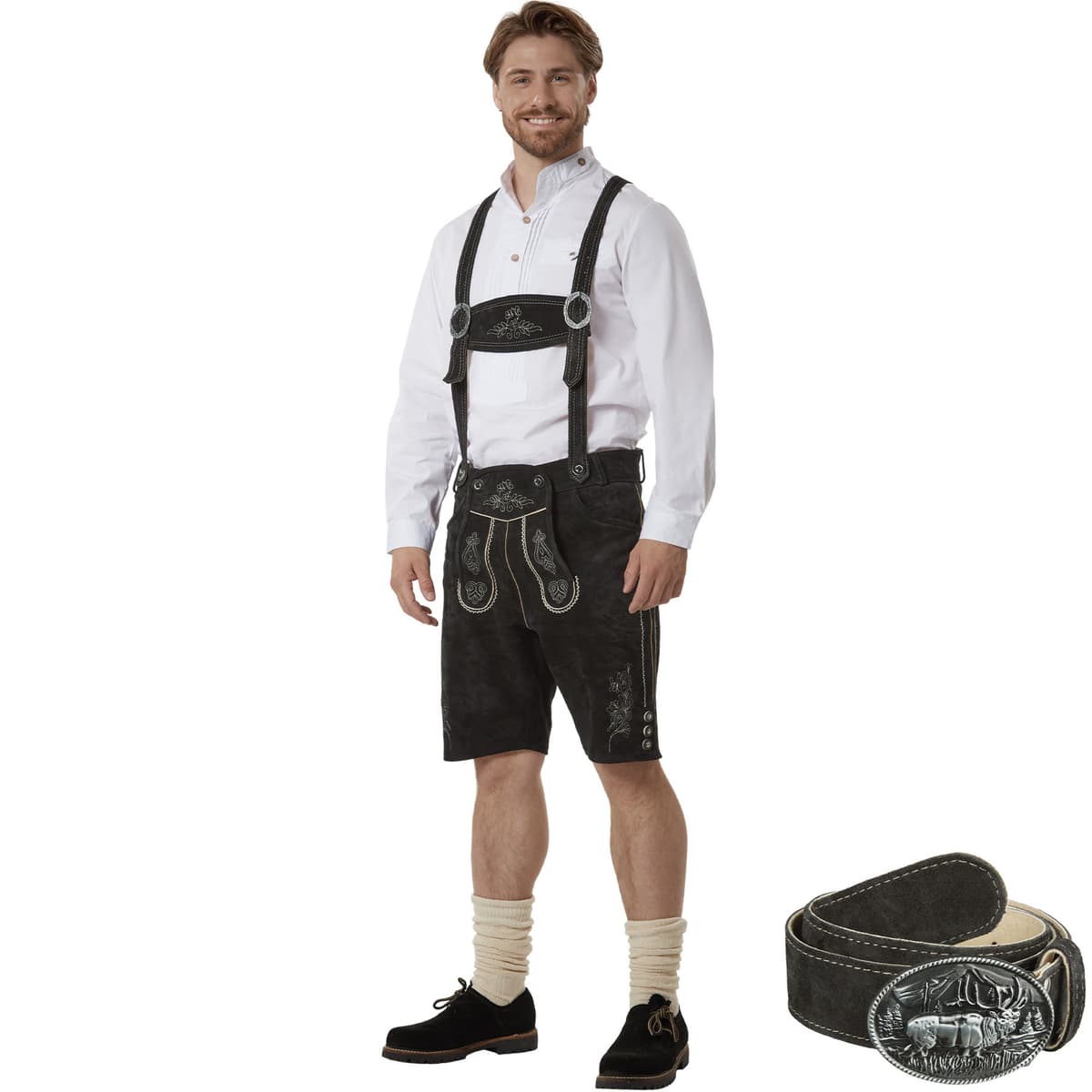 Vill du kombinera en traditionell stil med en modern passform? Då är läderbyxan Jannis precis rätt för dig. Den är tillverkad av äkta nötskinnsspaltläder – ett material känt för sin robusthet och naturliga charm. Med autentiska benknappar,högkvalitativa hängslen och ett massivt bälte erbjuder byxan allt som en folkdräktsentusiast kan önska sig.