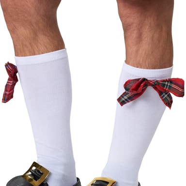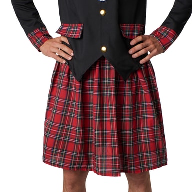 Herrdräkten Förnäm skotte består av en kilt med resår och knästrumpor med rosetter samt en långärmad kavaj med axelklaffar, gyllene knappar och kardborreband. De antydda fickorna samt uppvikta ärmarna är rutiga, axelklaffarna är guldprydda. Den stora spetskragen fästs med kardborreband. En mössa med resår i rutigt mönster rundar av dräkten, material: 100 % polyester.