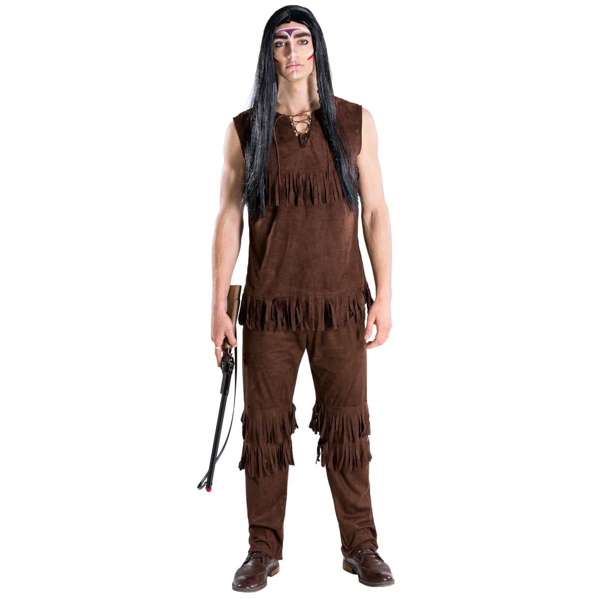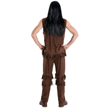 Maskeraddräkten Indian Hövding för herrar består av byxor av fuskmocka med praktisk resår och påsydda fransar i samma färgnyans. Till detta medföljer en ärmlös överdel av fuskmocka med ett vackert knytband i urringningen och påsydda fransar. Material: 100 % polyester.