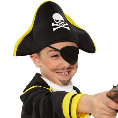 Ohoj! Rada upp er alla landkrabbor, här kommer kaptenen. Det vilda dödskalletecknet på båthatten samt den eleganta jackan med volangskjorta gör det tydligt vilken förnäm familj piraten kommer ifrån och vilken ställning han har. Respekten på däck har han helt säkert.