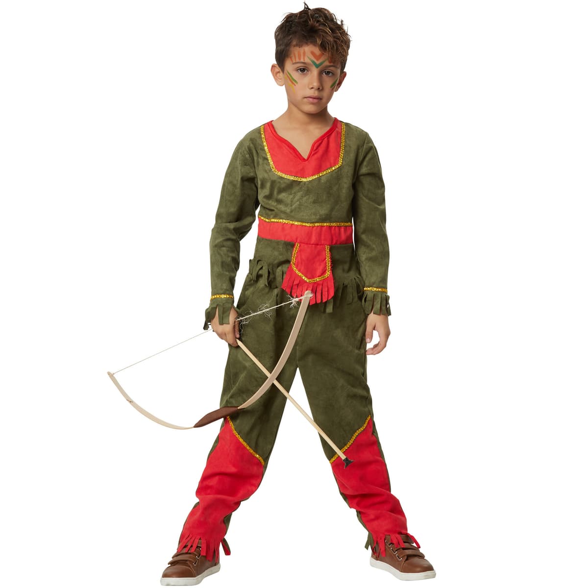 Den mockaliknande pojkdräkten Modig mohikan består av långa byxor med resår och fransigt mönster i ändarna. Nederdelen av byxbenen har en tyginsats fram som begränsas upptill med en gyllene bård. Även överdelen har dekorerats med fransar. Tyginsatser med gyllene bårder återfinns vid kragen och tvärs över magen. I mitten finns en lodrät tyginsats som avslutas med ett fransig mönster. Även de långa ärmarna pryds av en gyllene bård fram och avslutas med ett fransigt mönster, material: 100 % polyester.