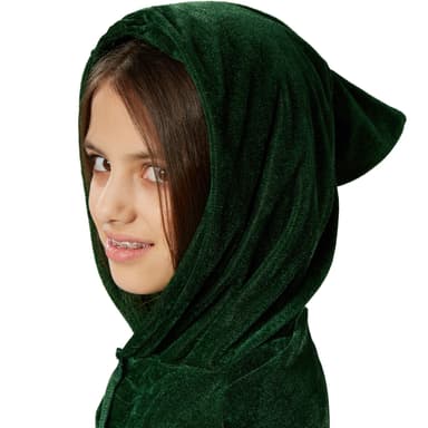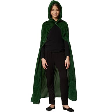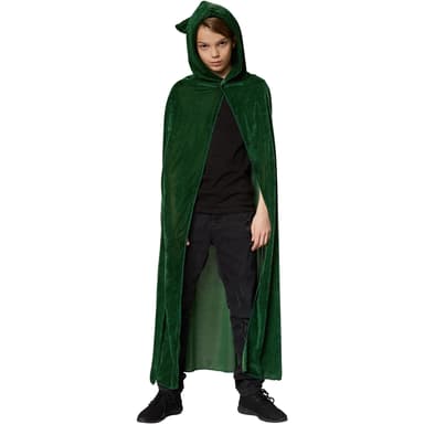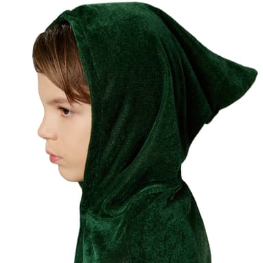 Grön Sammetscape för barn består av en mantelutan ärmar, kardborreband i halshöjd och en spetsig huva, material: 100 % polyester.