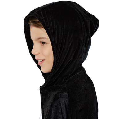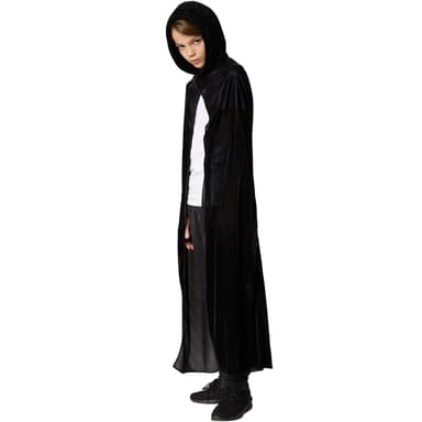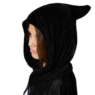 Den svarta Sammetscapen för barn består av en mantel utan ärmar, kardborreband i halshöjd och en spetsig huva, material: 100 % polyester.