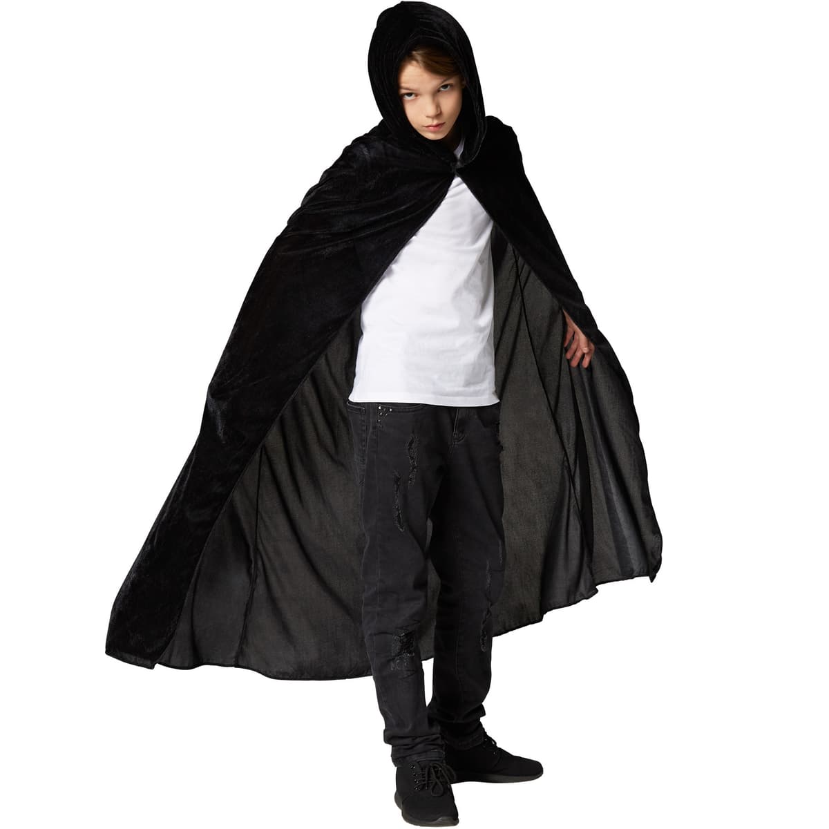 Den svarta Sammetscapen för barn består av en mantel utan ärmar, kardborreband i halshöjd och en spetsig huva, material: 100 % polyester.