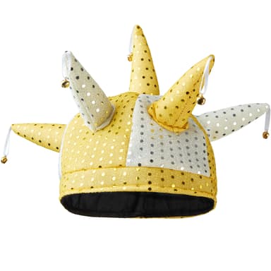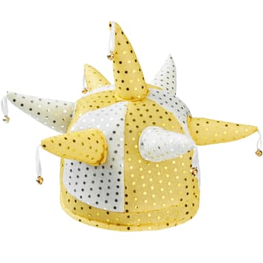 Bjällerklang, bjällerklang: Narrmössan med bjällror känner man igen på långt håll tack vare ljudet. Med färgerna vitt och guld, många glittrande prickar och sju horn är den dessutom ett blickfång. Med narrmössan med bjällror går det galet och klangfullt till på alla fester.
