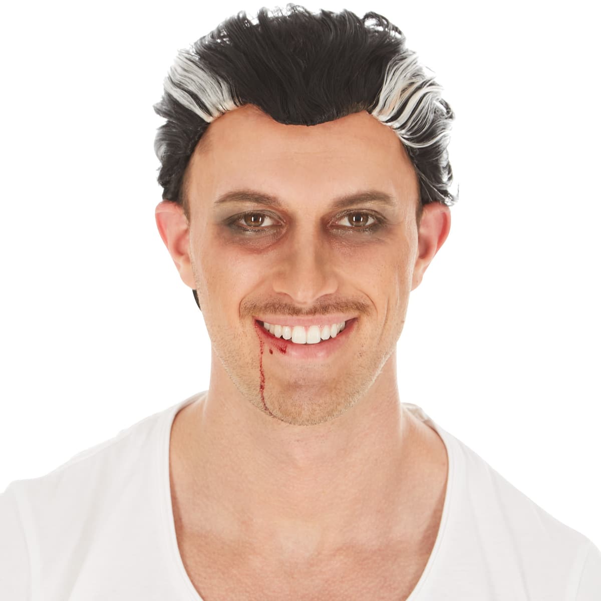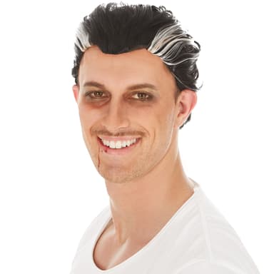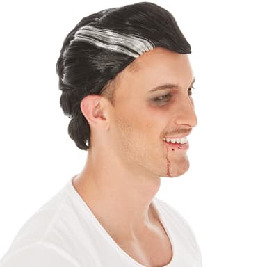 Peruken Greve Dracula gör dig till en äkta vampyr. Den har svart hår och ljusa hårpartier vid tinningen, hårlängd: ca 10 cm, material: 100 % polyester.