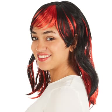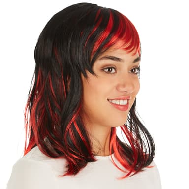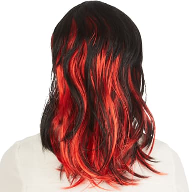 Peruken med flammor har en vacker uppklippt frisyr och lugg. Det syntetiska håret är svart med röda, iögonfallande slingor. Hårlängd: ca 50 cm, material: 100 % polyester.