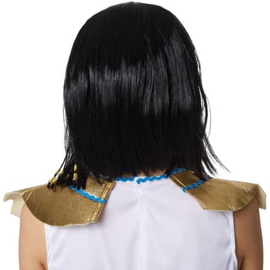 Kort peruk Kleopatra i egyptisk stil har en lugg och underbart vackra, flätade hårstrån med gyllene band i slutet av flätorna. Frisyren liknar bob-frisyr, hårlängd ca 30 cm, material: 100 % polyester.