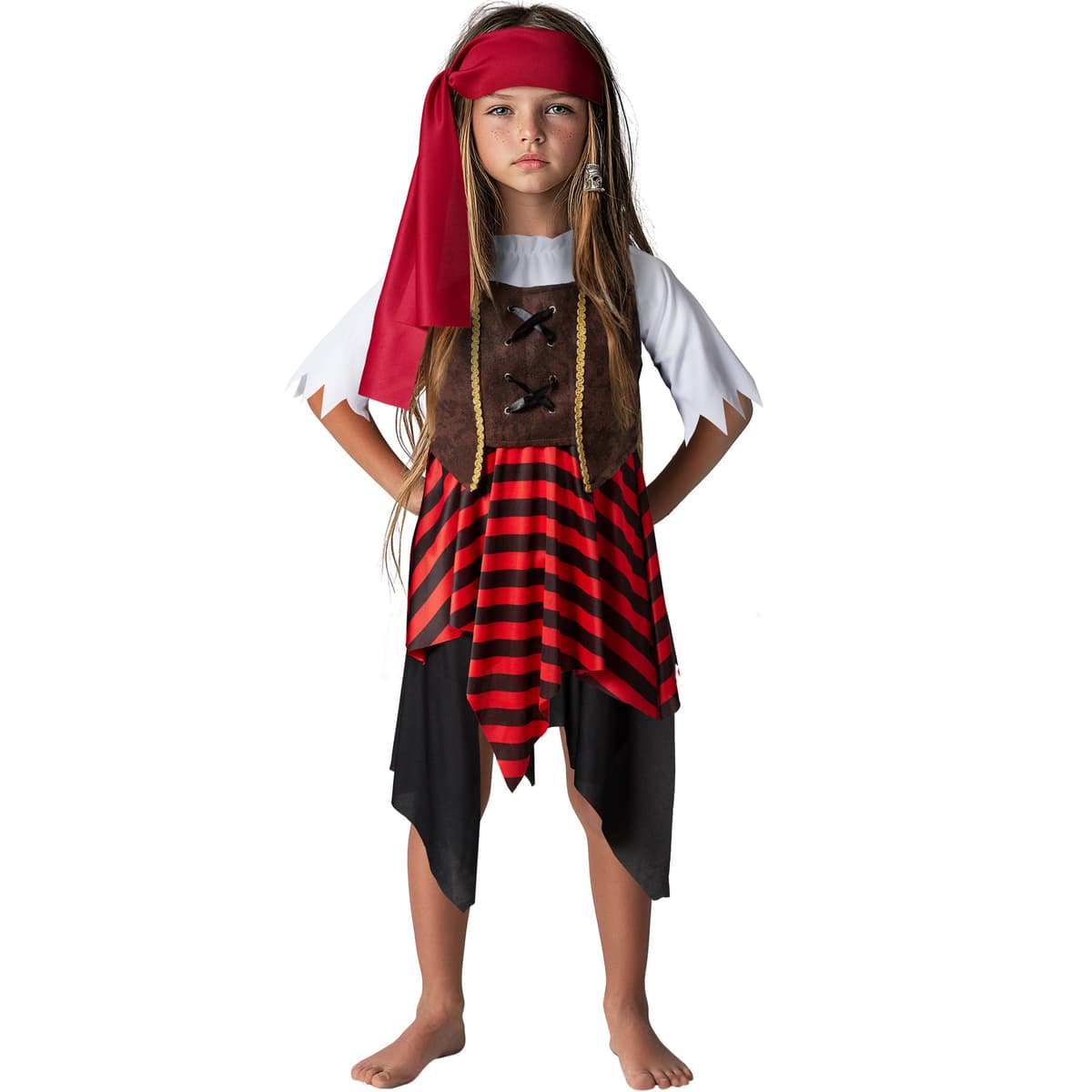 Klänningen är kärleksfullt designad och erbjuder mycket rörelsefrihet, så att du kan leka och dansa obehindrat. Den bruna korsetten ger en autentisk piratlook, medan det röda hårbandet kompletterar din stil. Komplettera kostymen med en leksakssabel eller en skattkista för att göra ditt piratäventyr ännu mer spännande.