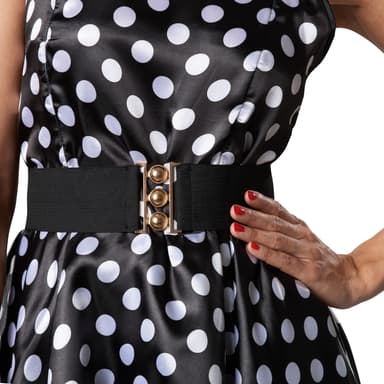Damdräkten Rockabilly Lady består av en prickig axelbandsklänning av glänsande tyg. Bältet med resår och vackert bearbetat spänne förstärker den figursydda formen och får kostymen att se uppdelad ut i en övre och en undre del. Kjolen har en påsydd fåll av spets, de båda underkjolarna är av satin och tyll, material: 100 % polyester.