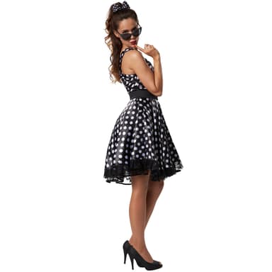 Damdräkten Rockabilly Lady består av en prickig axelbandsklänning av glänsande tyg. Bältet med resår och vackert bearbetat spänne förstärker den figursydda formen och får kostymen att se uppdelad ut i en övre och en undre del. Kjolen har en påsydd fåll av spets, de båda underkjolarna är av satin och tyll, material: 100 % polyester.