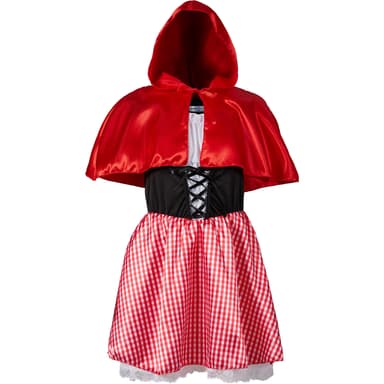 Klänningen erbjuder en elegant passform och skapar en vacker silhuett. Den lysande röda manteln med huva ger dig en mystisk och samtidigt lekfull charm. Kombinera kostymen med röda skor eller en korg för att fullända din Rödluvan-look.
