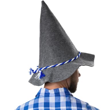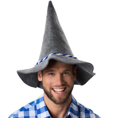 Gör din bayerska look komplett med den grå Seppelhatten röd/vit. Denna eleganta och autentiska huvudbonad finns tillgänglig i en universell storlek för vuxna. Den spetsiga formen och det breda brättet ger den traditionella looken. Med den här snygga hatten kan det roliga börja, Material: 100 % polyester.