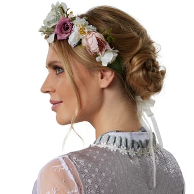 Den exklusiva blomsterkransen Sommerwiese är ett blickfång som passar för många tillfällen. Denna eleganta huvudbonad övertygar med sin naturlighet och de omsorgsfullt bearbetade detaljerna. Med satinbandet kan storleken anpassas individuellt. Den storslagna blomsterkransen Sommerwiese ger din outfit det där lilla extra, Material: plast, textil.