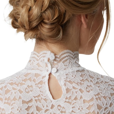 Tracht-blusen Hannerls design leker skickligt med motsatser. Det genomskinliga plagget med höghalsad blus och långa trumpetärmar är täckt av fin spets, som ser ut som ett hav av blommor. Det elastiska tyget har en utmärkt passform. I halsområdet stängs kragen med två knappar. Den mångsidiga blusen kan kombineras med olika outfits och är lika snygg till ett par jeans som till traditionell Tracht-klädsel, Material: 95 % polyester, 5 % elastan.