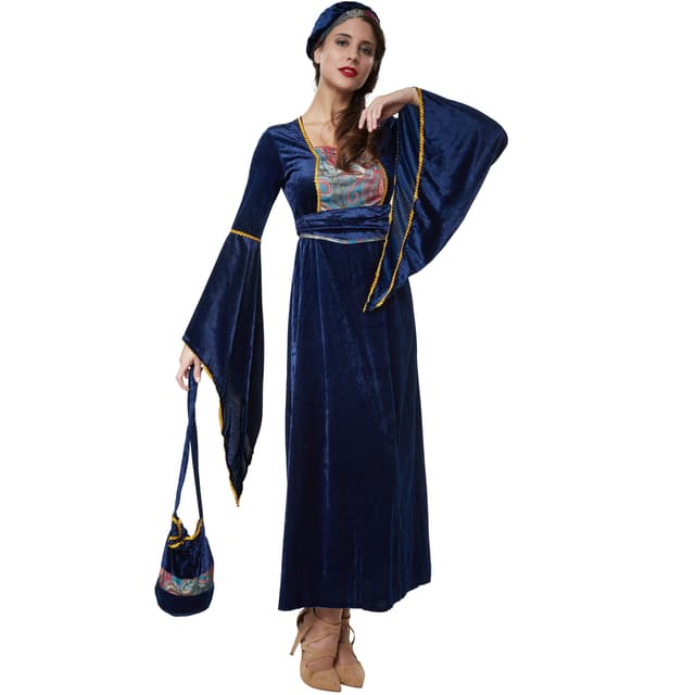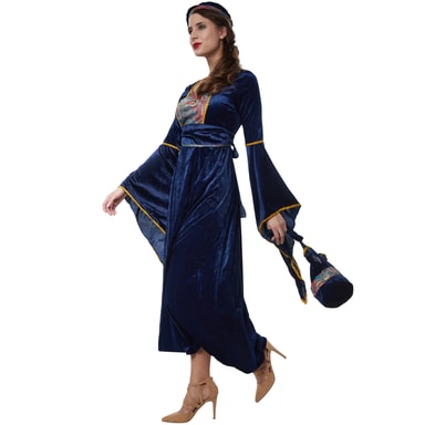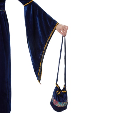 Damkostymen för den charmerande slottsjungfrun består av en ankellång klänning av mörkblå sammet. De långa, vida, utställda och asymmetriskt skurna ärmarna har en guldfärgad, dekorativ bård i höjd med armbågen och på ärmkanten. I området kring urringningen har kostymen en insats av färgrika ornament som kantas av en guldfärgad bård, som också fortsätter runt kragen. För en bättre passform har kostymen försetts med ett elastiskt band i midjan. Dessutom kantas bältet av blå sammet med ett lika färgglatt ornamenttyg. Huvudbonaden och bärpåsen är i samma optik, varvid den senare har ett elastiskt band och den övre änden pryds av en guldfärgad bård, material: 100 % polyester.