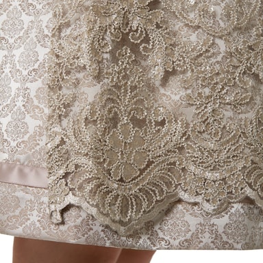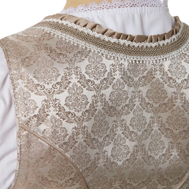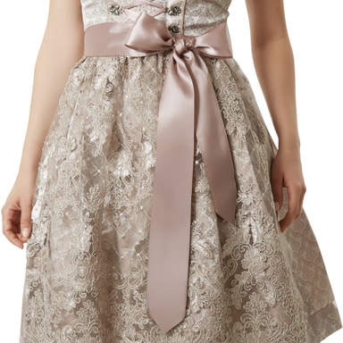 Dirndl-kjolen är prydd med blommiga ornament och får en lekfull och samtidigt lyxig touch genom det mjukt rosafärgade spetsförklädet. Särskilt raffinerat: De mjukt fallande vecken på baksidan ger en flytande rörelse vid gång och en elegant siluett.