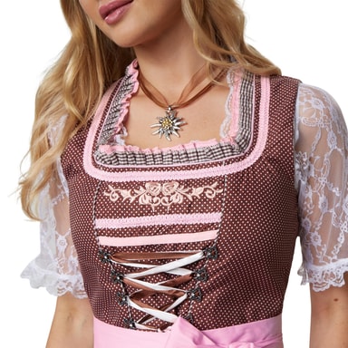 Denna figurbetonade mini-dirndl Altötting drar alla blickar till sig. Den figursydda outfiten har ett diskret prickigt mönster. Klänningens distinkta halsringning framhävs med ryschdetaljer och en dekorativ bård.Läs mer om produkten