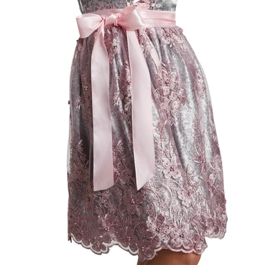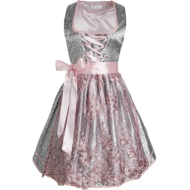 I den figurnära mini dirndl Sonthofen är du stjärnan på varje traditionell kostymfest. Klänningen är en dröm i silver med graciösa mönster och utsmyckningar i mjukt rosa. Filigranöglor och ett fint band bildar den smakfulla snörningen. En bård ramar in urringningen. Ytterligare två flätor pryder den korta kjolen, över vilken tyllförklädet bärs, som imponerar med sina kärleksfullt broderade blommor Material: 100% polyester.