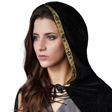 Damkostymen Duktig Jägarinna består av en knälång, grå klänning utan ärmar. Kostymen har ett påsytt svart band som går från höger axel och över bröstkorgen ner till vänster höft. Halsringningen har snörning. Kostymen är komplett med ett midjebälte i svart med guldgula ornament och två dekorativa bårder med gulbruna blommor. Vidare ingår armvärmare i svart med guldgula ornament och en kåpa med huva i svart sammet. Huven är spetsig och har en dekorativ bård vid sömmen, som är i samma mönster som midjebältet, material: 100 % polyester.