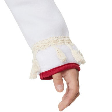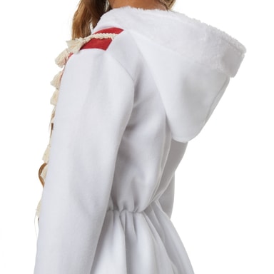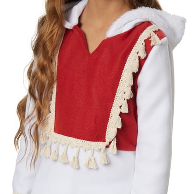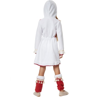 Flickdräkten Förtjusande eskimåflicka består av en kort klänning med inarbetad huva och benvärmare. Klänningen är gjord av vit sammet och ärmarna och kjolfållen pryds av vit plysch och ett rött band. Upptill finns en röd sammetsinsats. Den är inramad av en naturvit dekorbård med tofsar som ser virkade ut. Denna inramning återkommer i ärmarna och benvärmarna. Huvan är tillverkad av vit sammet och vit plyschkant. På baksidan av midjan finns ett elastiskt band för att ge dräkten bättre passform. Benvärmarna är gjorda av röd sammet med plyschkant, material: 100 % polyester.