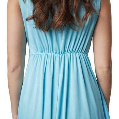 Den ärmlösa, monokroma damkostymen för Frihetsgudinnan är gjord av ett ljusblått, något glänsande tyg. Den djupa V-ringningen betonar snyggt dekolletaget. Nedanför bysten sitter ett elastiskt band. Det påsydda förklädet i klänningslängd och det på höger axel påsydda tyget kompletterar det delikata plagget, material: 100 % polyester.