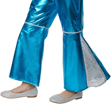 Den glittrande flickdräkten Disco Starlet består av ett stycke neonblått glänsande material. Den är lätt att ta på tack vare en generös dragkedja mitt fram. Den djupa V-ringningen samt påsydda kragen är bearbetade i populär 70-talsstil. Ärmarna och benen är vida och utställda. Vid knähöjd på benen finns en silverfärgad dekorbård. Kragen samt insatserna på ärmar och ben är tillverkade av genomskinligt, ljusgrått tyg med inarbetade silverfärgade trådar. De pryds även av paljettliknande silverfärgade glänsande prickar. Ett silverfärgat bälte med ädelstålfärgat spänne medföljer också, material: 95 % polyester, 5 % elastan.