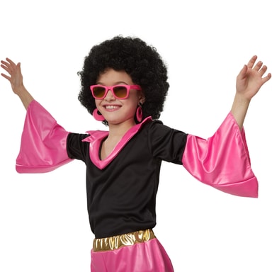 Flickdräkten Groovy Disco Girl består av en överdel och byxor. Den svarta blusen har en påsydd krage av ett rosafärgat, matt skimrande tyg. De påsydda trumpetärmarna och matchande byxorna är gjorda av samma tyg och samma färg. En guldfärgad byxlinning med resår ser till att dräkten sitter ordentligt. De utställda byxbenen börjar redan i grenen, material: 100 % polyester.