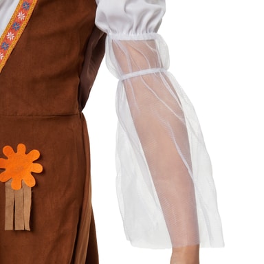 Flickdräkten Groovy Hippie Squaw består av en kort klänning och en påsydd, ärmlös mockaliknande väst. De korta ärmarna med resår har påsydd tyll som avslutas i trumpetform. Även vid halsen finns en resårinsats.Läs mer om produkten