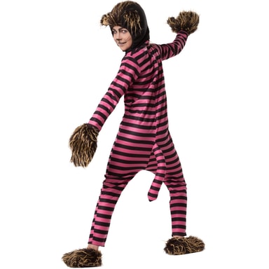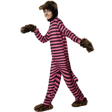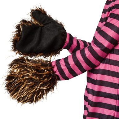 Uni6dräkten Hemlighetsfull flinande Cheshirekatt består av en overall med dragkedja bak, huva med kardborreband under hakan, handskar samt skor. Overallen pryds av rosa-svarta ränder på tvären och en kattsvans med ståltråd nedtill på ryggen. Huvan med kattöron, handskarna samt skorna är av svart plysch med konstpälsbräm, material: 100 % polyester.
