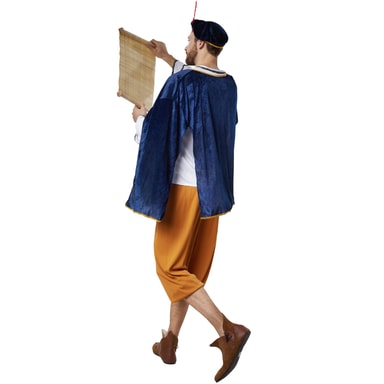 Den fyrdelade herrkostymen för den Höviska Härolden består av 3/4-byxor av satin med elastisk linning och långärmad satinskjorta med V-ringning och ett snörband. Runt kragen och i ärmarnas främre del sitter påsydda dekorativa band med punkter. Sjalen och huvudbonaden består av sammet och kantas av en gyllene bård. Dessutom är huvudbonaden dekorerad med en fjäder, material: 100 % polyester.