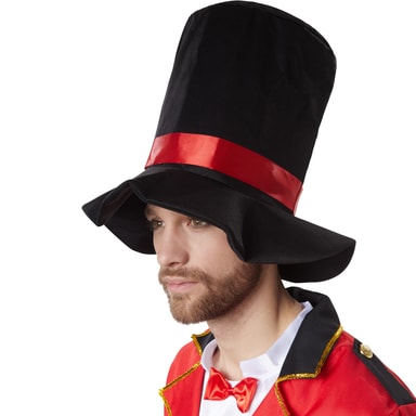 Den femdelade herrkostymen för denna Käcka Cirkusdirektör består av en smoking, en ärmlös satinskjorta med skört, byxor, en maggördel och en stor hatt. Den röda fracken har en typisk gåslits bak, som även kallas svalstjärt. Kragen och ärmarna i svart och rött har en dekorativ gyllene bård. Fracken stängs med två guldknappar. De svarta axelklaffarna är också försedda med guldknapp. Den ärmlösa, vita satinskjortan har ett påsytt rött band vid halsen. De svarta långbyxorna har ett elastiskt midjeband och rakt snitt. Den svarta glänsande maggördeln stängs med kardborreband. Kostymen blir komplett med den svarta, stora hatten med brett brätte och rött satinband, material: 100 % polyester.