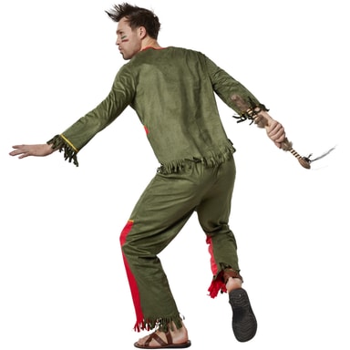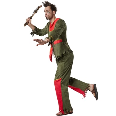Den lågmälda mohikanens herrkostym i mockaoptik har långa elastiska byxor och fransmönster i ändarna. Den under delen av byxbenen har en tyginsats som begränsas upptill med en gyllene bård. Överdelen har dekorerats med fransar. Tyginsatser med gyllene bårder är placerade vid kragen och sträcker sig tvärs över buken samt i mitten och avslutas med fransar. Även de långa ärmarna pryds av en gyllene bård och avslutas med fransar, material: 100 % polyester.