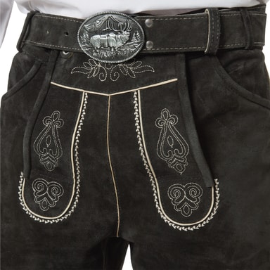 Visuellt sticker lederhosen-byxorna ut tack vare sina kontrasterande vita broderier på klaffen och längs benen. Dessa klassiska ornament ger tyrolerbyxorna en särskilt traditionell touch och gör dem till den perfekta följeslagaren på oktoberfesten eller temafesten!