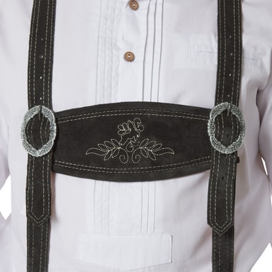 De äkta hornknapparna understryker lederhosenshortsens äkthet och harmoniserar perfekt med det rustika lädret. Det medföljande bältet med metallspänne ger optimalt stöd och fulländar helhetsintrycket. De justerbara läderhängslena med broderad bröstrem säkerställer stabilitet och komfort – utan att glida ner.