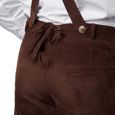 Tillverkade av högkvalitativt material med mockaliknande utseende imponerar dessa lederhosen med sin eleganta känsla och exceptionella komfort. Det mjuka materialet känns bekvämt mot huden och det robusta hantverket gör byxorna slitstarka och lättskötta så att du kan njuta av denna fina oktoberfestdräkt under lång tid.