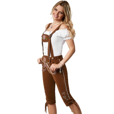 Dessa lederhosen kombinerar rustik charm med feminin elegans och ger din traditionella outfit en elegant men lekfull touch. Med sin knälånga passform och färgglada blombroderier är de den perfekta följeslagaren för Oktoberfest eller maskerader. Oavsett om de kombineras med en dirndlblus eller en enkel t-shirt så kommer dessa ""läderbyxor"" alltid att skapa en perfekt outfit.