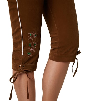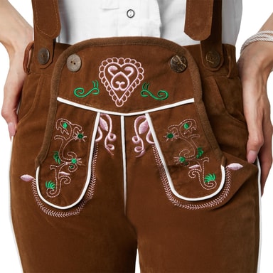 Dessa sexigt rustika men samtidigt fräckt feminina Lederhosen-byxorna Walchensee är knälånga. Ett snyggt blickfång är de färgglada broderierna i hjärt- och blomform. De olika justeringsmöjligheterna ger en perfekt passform.Läs mer om produkten