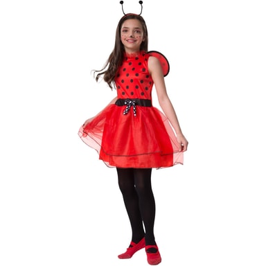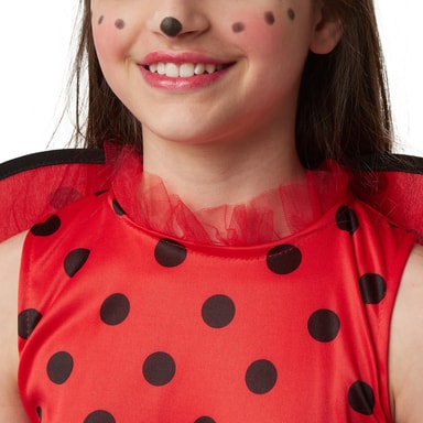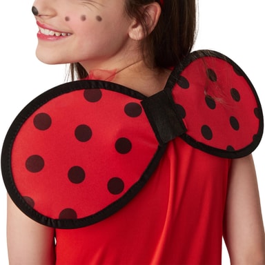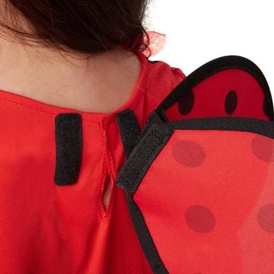 Flickdräkten Lilla lyckobringare Mariella består av en kort klänning, vingar samt ett diadem. Den röda klänningen med svarta prickar är ärmlös och har en volangkrage av tyll. Midjan är i kontrasterande svart och pryds av en svart rosett med vita prickar. Kjolen är i tre lager, de båda övre kjolarna är av tyll och har en smal, svart dekorkant nedtill. Dräkten knäpps med kardborreband i nacken. De prickiga vingarna i rött och svart fästs också med kardborreband i ryggen. Det matchande röda diademet med svarta känselspröt gör dräkten komplett, material: 100 % polyester.