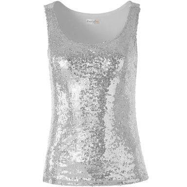Mycket glamour och en snygg utstrålning betecknar detta snygga paljettlinne för kvinnor. När linnet utsätts för ljus eller rörelse skapar de otaliga, tunna paljetterna på framsidan ett magiskt glittrande och gnistrande. Denna ärmlösa överdel med rund halsringning sätter armar och axlar i fokus. Det elastiska materialet gör den lätt kroppsbetonade överdelen med rund halsringning bekväm och behaglig att ha på sig, Material: 100 % polyester.