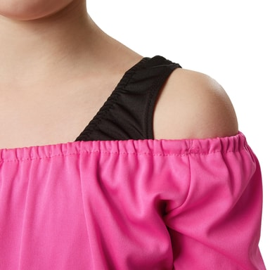 Flickdräkten Liten fitness-stjärna består av body, byxor, överdel samt benvärmare. Den svarta bodyn med ljusblå och vit rand har resår. De ljusblå, långa byxorna är figurbetonade och har också resår. Den långärmade, rosa överdelen med resårurringning lämnar magen bar och dras över bodyn. Benvärmarna av rosa garn dräkten komplett, material: 100 % polyester.
