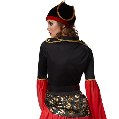 Maskeraddräkten Piratdrottning består av en klänning med snörning, en sjörövarhatt med rött band och ett bälte. Material: 100 % polyester.