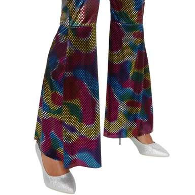 Damdräkten Disco Girl består av en overall med holderneck-överdel och utställda ben. Regnbågsfärgade prickar lyser i neonglans mot den svarta bakgrunden. Dräkten stängs med hjälp av en lång dragkedja i ryggen, material 100 % polyester.