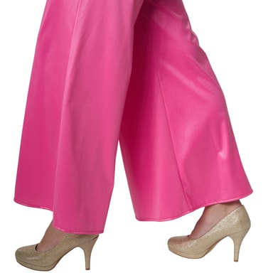 Damkostymen Discostjärna Pinky består av en överdel och byxor av elastisk jersey. Den svarta blusen har en påsydd krage av ett rosafärgat, matt skimrande tyg. De påsydda trumpetärmarna och matchande byxorna är gjorda av samma tyg och samma färg. En elastisk guldfärgad byxlinning ger en bättre passform. Byxans utställda ben börjar från gånghöjd, material: 100 % polyester.