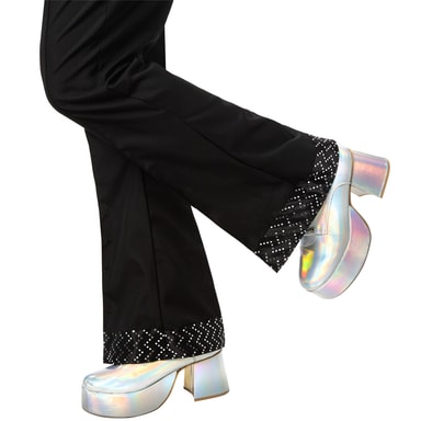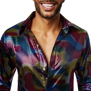 Herrdräkten Disco King består av långa byxor med pressveck, vida slag, knapp, dragkedja, resårinsatser och bälteshällor. På den breda avsatsen finns ett mönster av glittrande prickar. Den långärmade skjortan med knappar har en krage och ett regnbågsfärgat mönster av glänsande prickar, material: 100 % polyester.